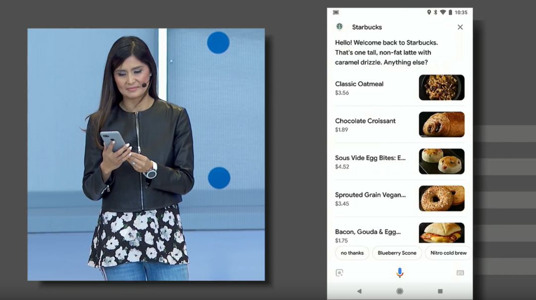 除了自然语言处理能力的改善之外,Google 将另一个改进的地方放在视觉的辅助——Visually Assistive,Google Assistant 产品经理主管 Lilian Rincon 举例,例如你问星巴克咖啡店,手机就会同时展示出咖啡店菜单内容。