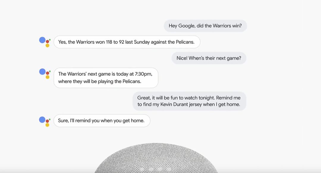 之后 Google Assistant 副总裁 Scott Huffman 播了一段在网上超火一名老奶奶不太会使用 Google Home 智能音箱的影片,指出使用者体验还有很大的进步空间,因此他示范了几个新功能:Multiple Actions——增强智能语音助理与人类自然、来回“对话”的能力。