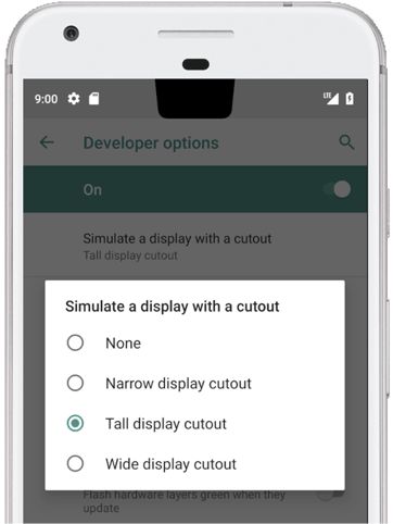 企业根据全屏幕手机面板感测器的排列,以新的雷射切割制程技术做任意形状的切割,在 Notch 的位置便可以安装多个感测器与前置镜头,让手机达到全屏幕设计。而 Google 也顺应趋势,让 Android P 可以支持异形切割的全面屏,将其称为“DisplayCutout”,并提供企业跟开发者三种设计选择。