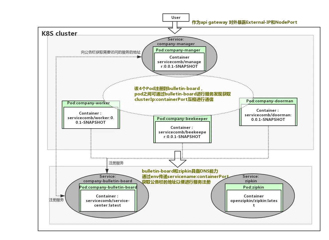 该yaml文件定义了副本数为1(replicas: 1)的pod,可以通过修改该副本数控制所需启动的pod的副本数量(当然也可以使用K8S的弹性伸缩能力去实现按需动态水平伸缩,弹性伸缩部分将在后面的博文中提供)。前面我们提到过company-bulletin-board具备了DNS的能力,故现在可以通过该Deployment中的env传递cse.service.registry.address的值给pod内的服务使用,如: -Dcse.service.registry.address=http://company-bulletin-board:30100, kube-dns将会自动解析该servicename。