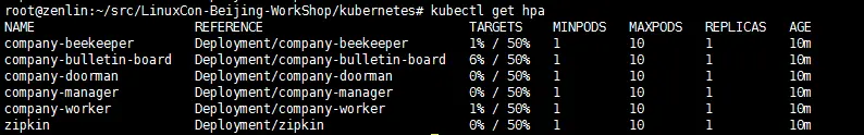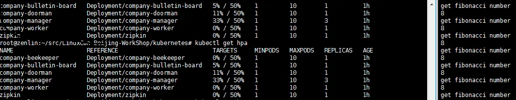 当运行start-autoscale.sh之后,具备弹性伸缩器的company已经被创建,可通过下面指令进行HPA的查询: