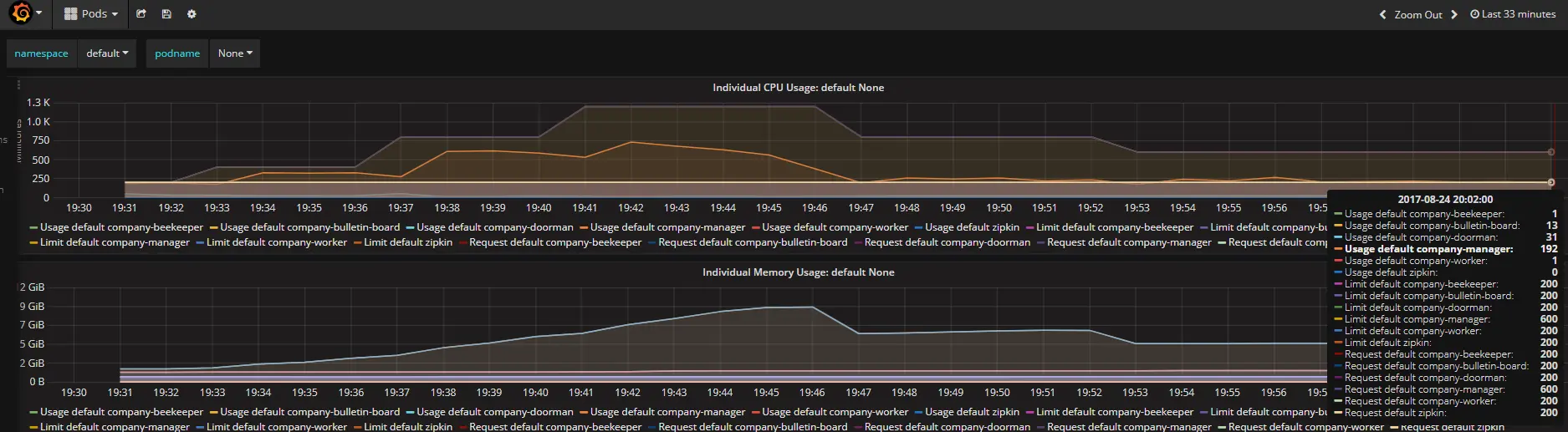 1. 压力主要集中在company-manager这个pod上,K8S的autoscaler通过弹性增加该pod的副本数量,最终达到目标:每个pod的cpu占用率低于限定值的50%(图5,Usage default company-manager/Request default company-manager = 192/600 约等于图4中的33%),并保持稳定。