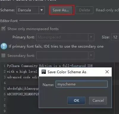 然后选择Editor-Colors&Font-Font,我们把字体弄大点,由于默认的主题字体不能修改,我们选择Darcula然后save as一个新的主题。然后就可以修改字体大小了,14-16我觉得比较合适。