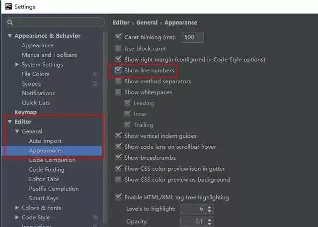 选择-Editor-General-Appearance 选择show line numbers显示行号