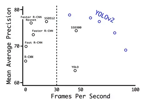 以下是 YOLO 论文中不同检测器的 mAP 和 FPS 对比。YOLOv2 可以处理不同分辨率的输入图像。低分辨率的图像可以得到更高的 FPS,但 mAP 值更低。