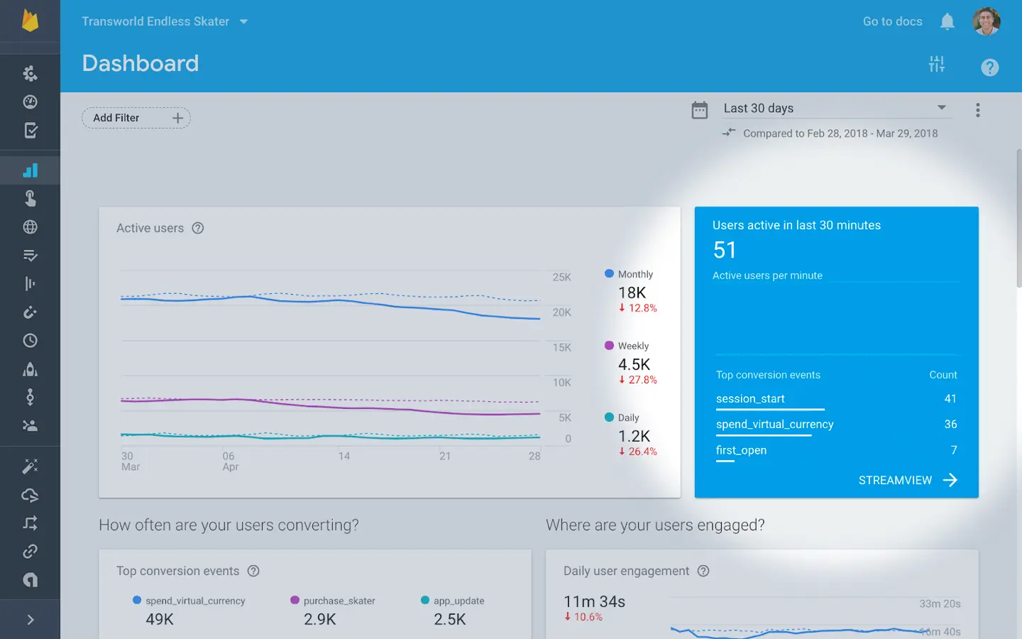使用 Google Analytics for Firebase,你可以看到每个引用的分析结果。去年,我们增加了试试查看数据的功能,并且他添加了 StreamView 和 DebugView报告。现在,你会注意到我们在 Google Analytics 报告中添加了实时卡,以便你更好的了解用户在使用应用的那些功能。