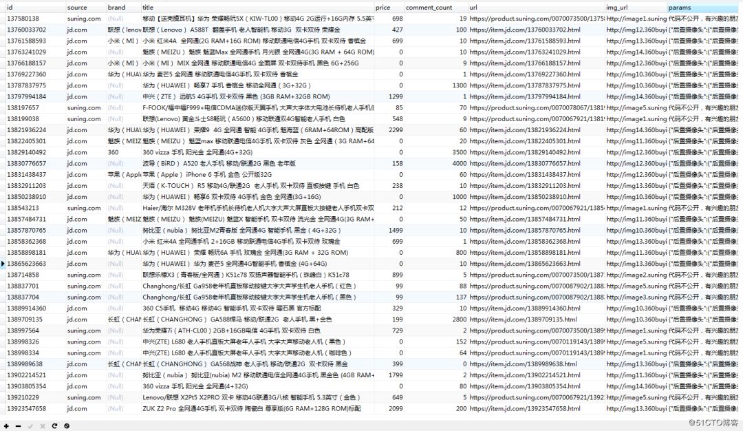 -- ------------------------------ Table structure for phone-- ----------------------------DROP TABLE IF EXISTS `phone`;CREATE TABLE `phone` ( `id` varchar(30) CHARACTER SET armscii8 NOT NULL COMMENT '商品id', `source` varchar(30) NOT NULL COMMENT '商品来源,如jd suning gome等', `brand` varchar(30) DEFAULT NULL COMMENT '手机品牌', `title` varchar(255) DEFAULT NULL COMMENT '商品页面的手机标题', `price` float(10,2) DEFAULT NULL COMMENT '手机价格', `comment_count` varchar(30) DEFAULT NULL COMMENT '手机评论', `url` varchar(500) DEFAULT NULL COMMENT '手机详细信息地址', `img_url` varchar(500) DEFAULT NULL COMMENT '图片地址', `params` text COMMENT '手机参数,json格式存储', PRIMARY KEY (`id`,`source`)) ENGINE=InnoDB DEFAULT CHARSET=utf8;