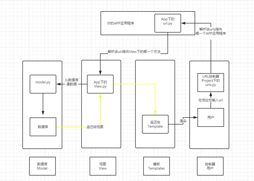 2.进入应用程序后,app下的urls.py会解析你的下一个方法,并跳转到views.py下去使用那一个方法,同时为了能够体现一些内容在页面上,views会去调用models.py下的内容