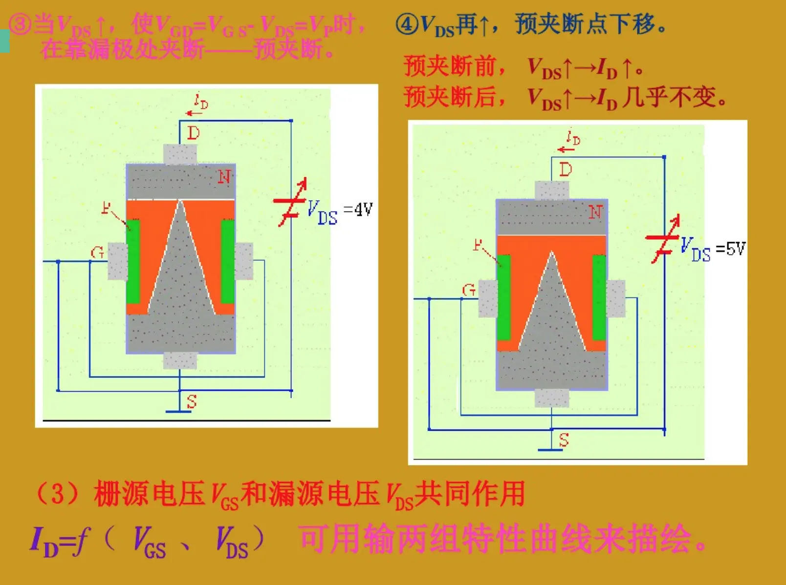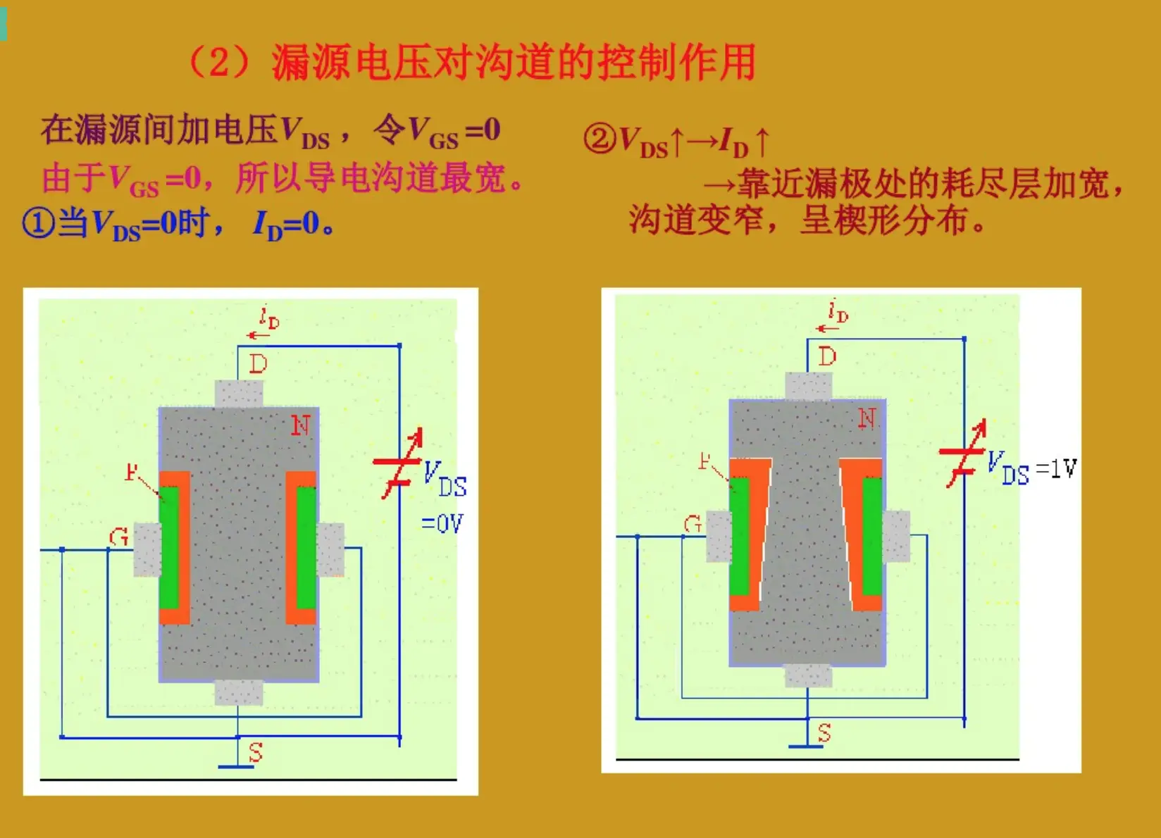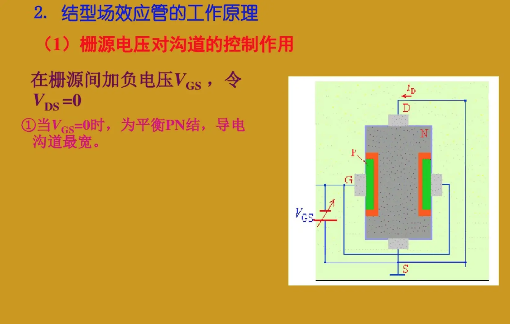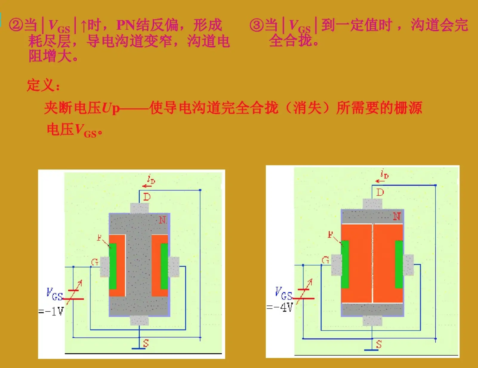 当 Vgs 负电压增大,电子流入 P 沟道,P 沟道载流子减少,N 沟道为平衡 PN 结的内电场,N 沟道的载流子也变小,从而导致 PN 结变宽。