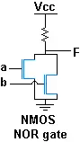当 a、b 中任意一个为高电平,则 F 和 GND 连接为低电平,只有 a、b 都为低电平时,F 才为高电平。