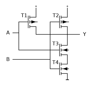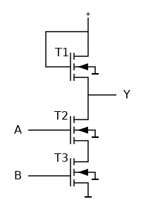 NMOS, 仅 A,B 都为高电平使得 T2,T3 导通,Y 才为低电平