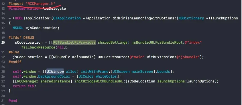 self.window = [[UIWindow alloc] initWithFrame:[UIScreen mainScreen].bounds]; self.window.backgroundColor = [UIColor whiteColor]; [[RCCManager sharedInstance] initBridgeWithBundleURL:jsCodeLocation launchOptions:launchOptions];