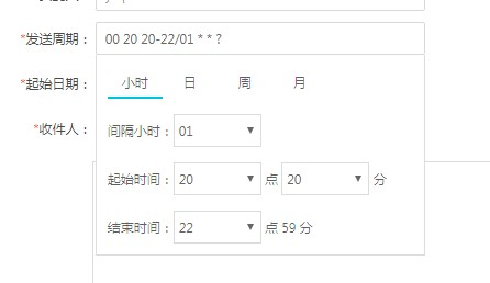 8.设置发送周期,可以按照需求选择设置,如下示例选择从20点20分到22点,每小时整点发送。
