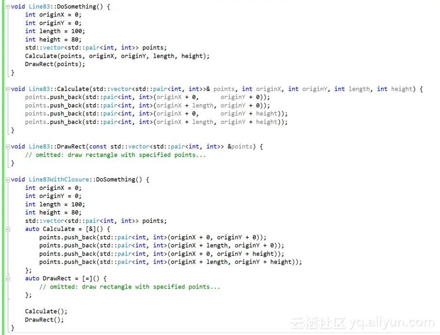 有了 closure 就好办多了!我们可以在 DoSomething() 里直接定义 Calculate(), 用 [&] 把所有 variables on the stack 传进去。整个写法简洁很多,也易于维护,一方面参数的增删不再需要更多的工作,另一方面,更为重要的是,Calculate() 已经完全定义在 DoSomething() 里面了,从结构上直接告诉读者它们的从属关系!(NOTE: 当然也可以用一个 inner function 来写,可是参数传递不够爽)