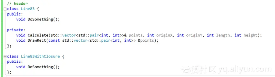范例里面,我们要写的 DoSomething() 需要做两件事情,Calculate() 算出一个矩形的四个顶点,然后 DrawRect() 去画它。这样的情况在实际代码中很常见,一个函数因为复杂,要分几步去做,最好分成几个子函数。但是问题是需要传递好几个参数,头痛了!第一种写法,无奈之下只能把所有参数一一列出,然后 header 里就多了个 Calculate(......) 长长的子函数,需要传进传出多个变量。