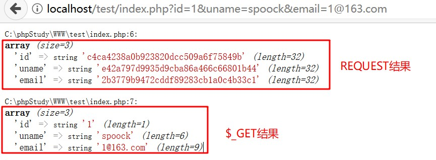 我们访问http://localhost/test/index.php?id=1&uname=spoock&email=1@163.com的结果如下: