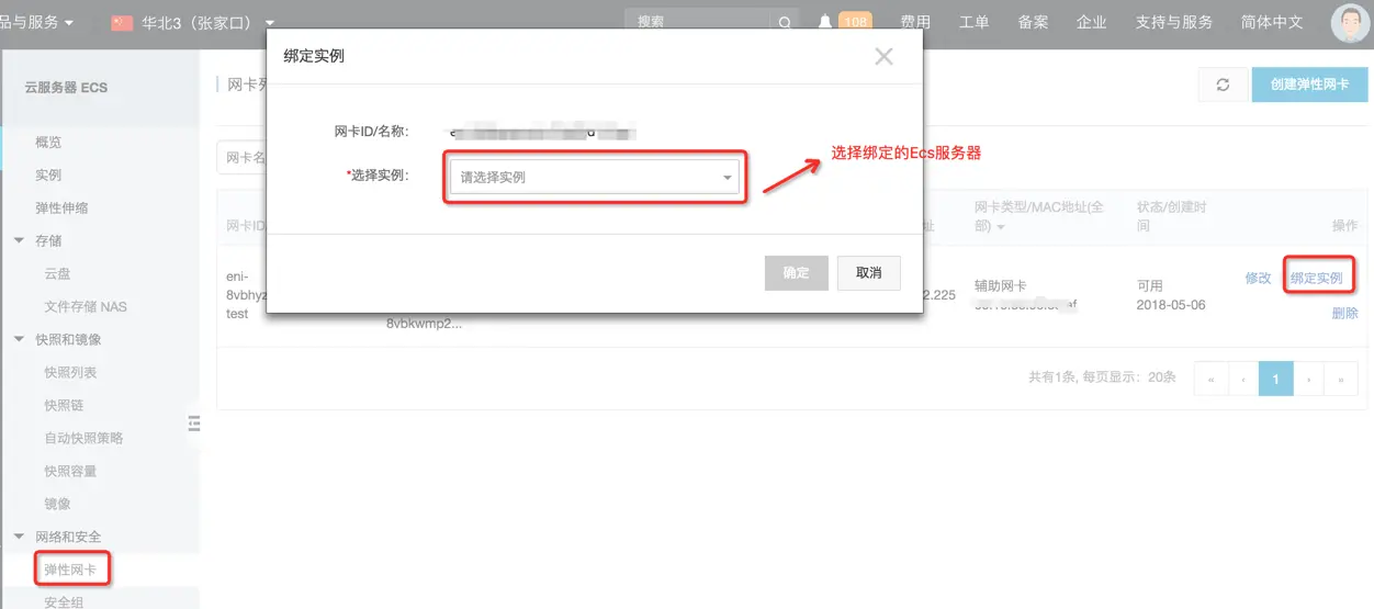 绑定实例按钮,在弹窗中选择要绑定实例。实例状态只要求为稳定状态(RunningStopped)。 - 热卸载弹性网卡:点击弹性网卡对应的