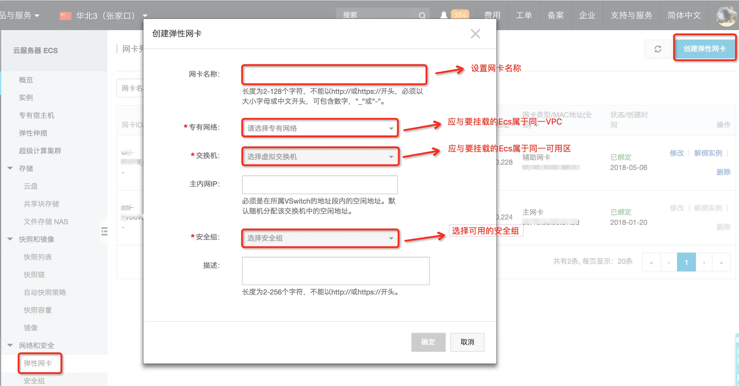 创建弹性网卡按钮,在弹窗中填写网卡名称,选择专有网络 交换机 安全组等信息后创建弹性网卡。 - 热挂载弹性网卡:点击弹性网卡对应的