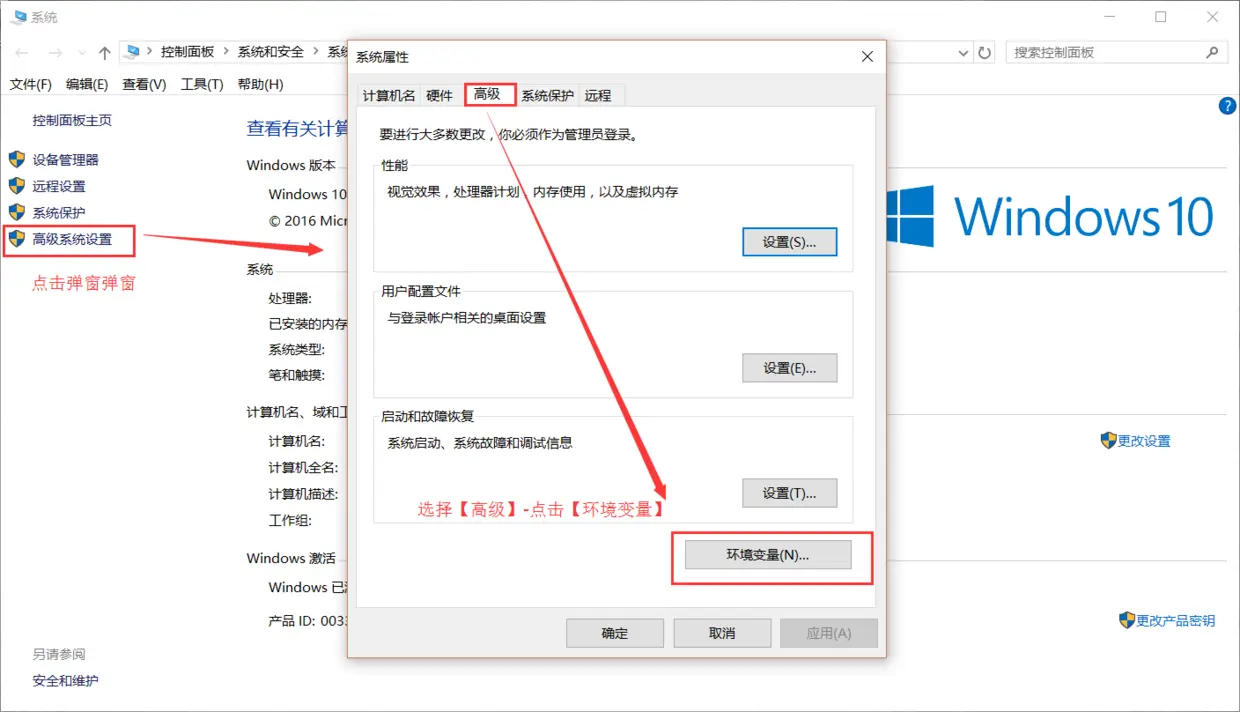 关闭cmd窗口,“我的电脑”-右键-“属性”-“高级系统设置”-“高级”-“环境变量”
