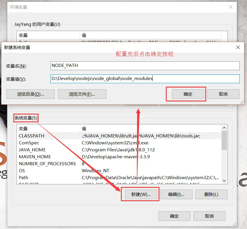 进入环境变量对话框,在【系统变量】下新建【NODE_PATH】,输入【D:\Develop\nodejs\node_global\node_modules】