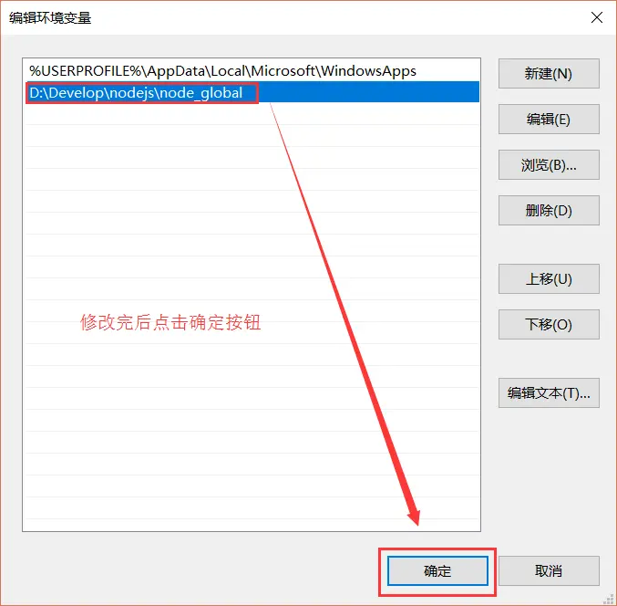 将【用户变量】下的【Path】修改为【D:\Develop\nodejs\node_global】