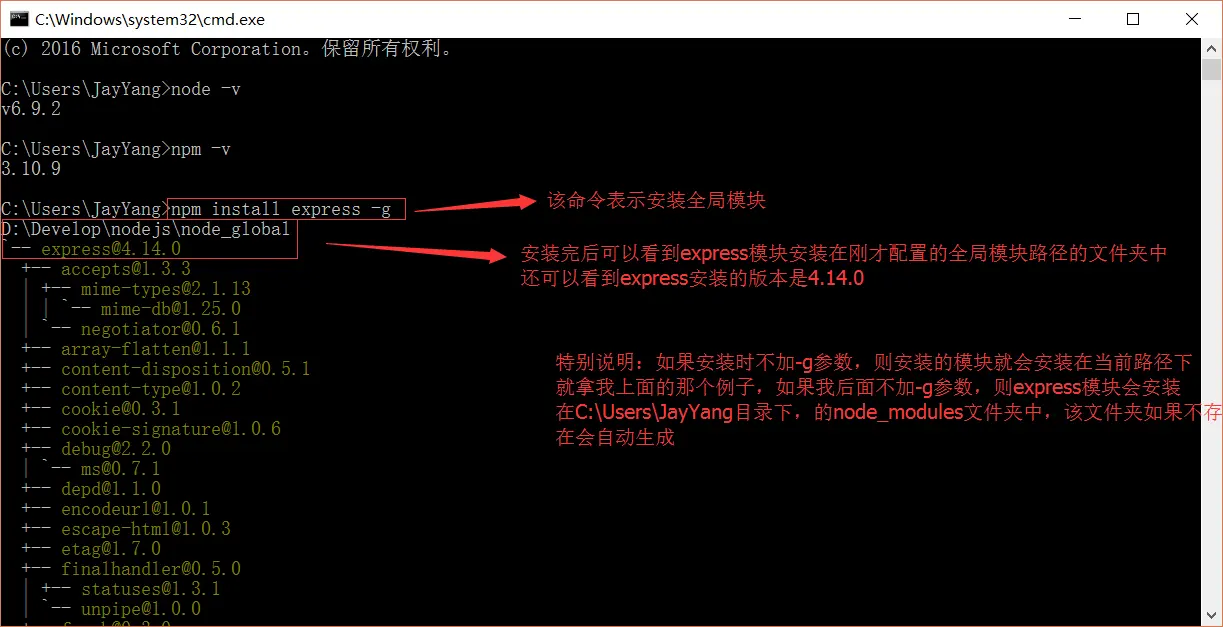 输入如下命令进行模块的全局安装:npm install express -g -d