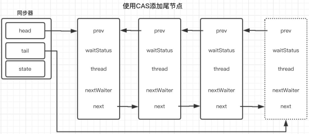 AbstractQueuedSynchronizer类中其它方法主要是用于插入节点、释放节点,插入节点过程如下图所示: