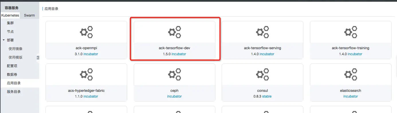 2.1 可以通过应用目录,点击ack-tensorflow-dev