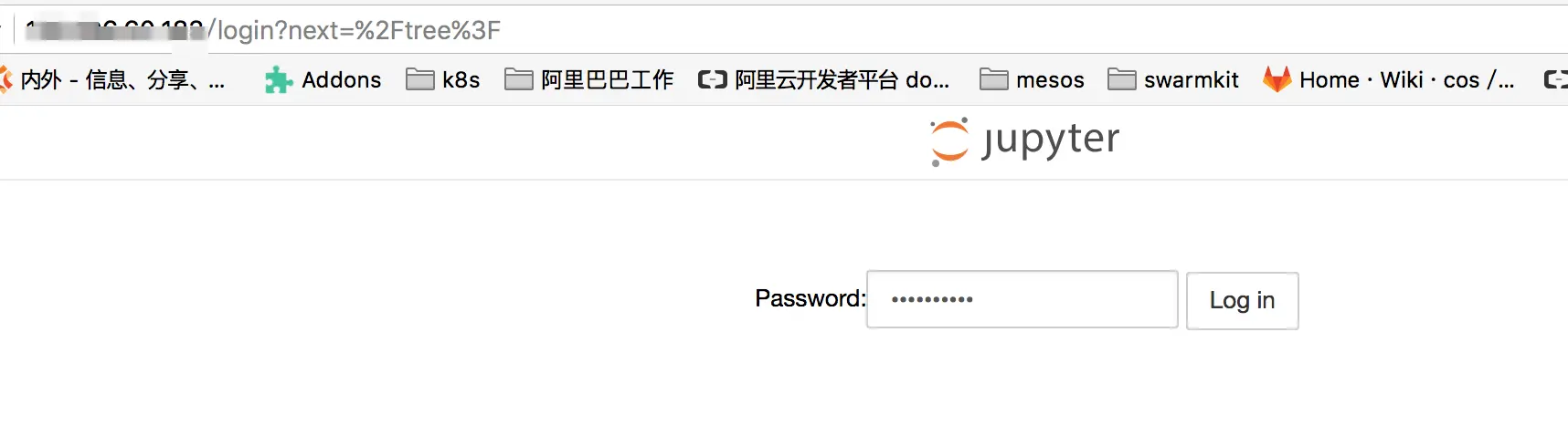 3. 通过Jupyter访问端点登录,本示例中Jupyter的访问地址是http://10.0.0.1, 输入前面设定的密码点击登录, 在本示例中我们设定的是tensorflow