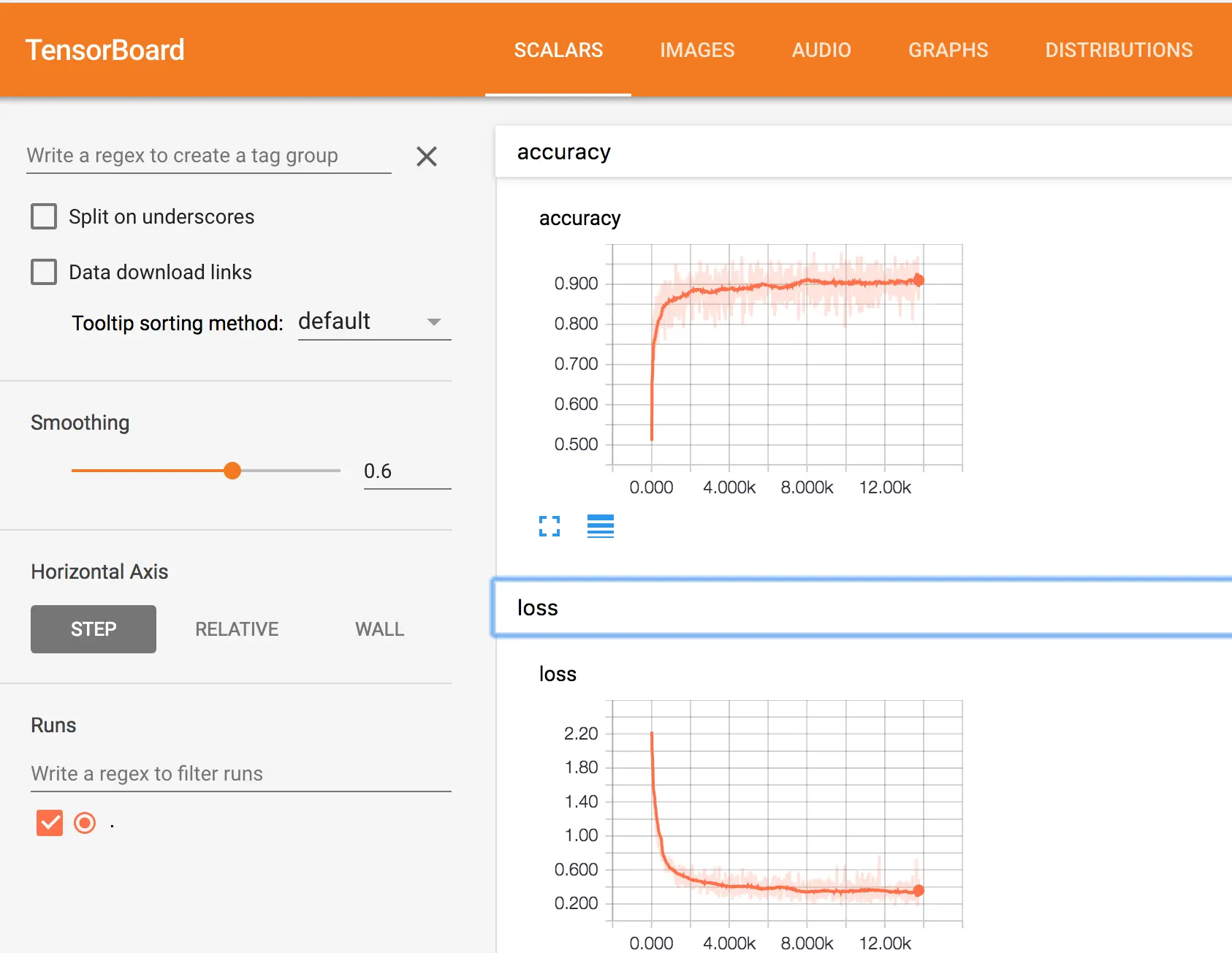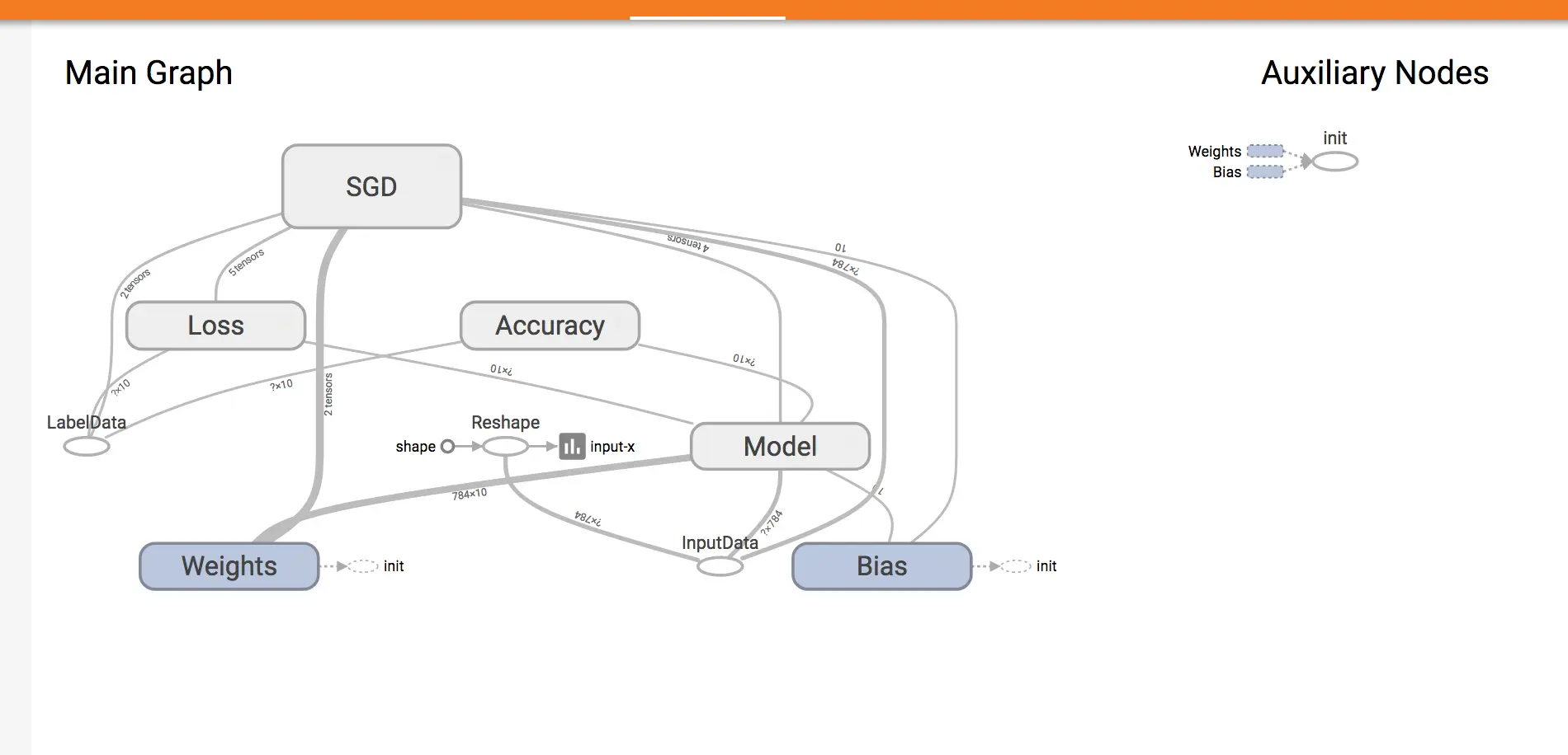 10. 这时您可以登录Tensorboard查看训练效果, 本示例中Tensorboard的地址为http://10.0.0.1:6006 。 这里您可以看到模型的定义和训练的收敛趋势。