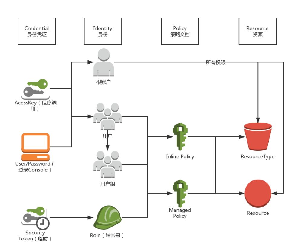 当服务方接入IAM,常常需要一个思路上的转化:服务方自己其实不是资源的拥有者!在IAM体系中,资源的拥有者是首次申请资源的根帐号,根帐号再将权限切割出来分配给子用户。服务方仅提供服务能力,在控制台内不能对资源做任何管控,管控是由业务方自主完成的!