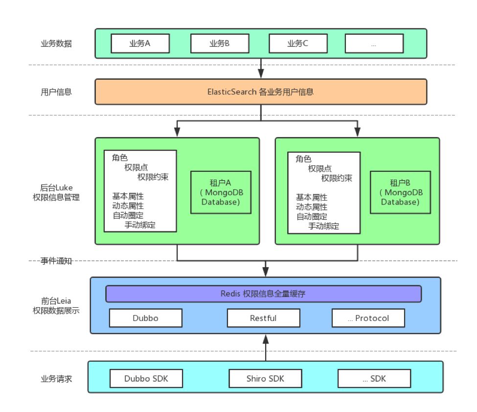 使用方式为:业务接入方,在用户登陆后,向我们拉取权限信息,缓存在本地;之后所有的操作,即可通过角色信息,权限点列表,和权限对应的数据约束,解释出yes or no的结果。