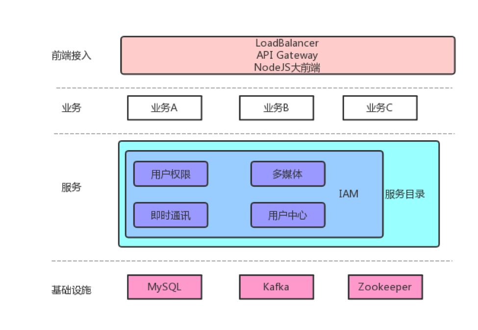 上图是我们预期的整体架构。业务层负责对接具体的业务,其他所有层为其赋能;服务层提供业务无关的通用能力,但不直接参与到具体的业务实现;基础设施层提供稳定可靠的存储/计算等能力。业务到服务间通过IAM授权,用户通过服务目录管理资源。所有层都具有监控报警等基础能力。