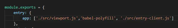 - 根据屏幕大小动态设置HTML根字体大小和viewport scale。实现这一点这个项目用到了hotcss这个工具,但由于官方配置略麻烦,也没有相应的webpack项目官方配置说明,这里直接把hotcss里的src目录下的hotcss.js内容拷贝出来,在自己项目中新建一个viewport.js的文件,把hotcss.js里的内容黏贴进去。然后在webpack的config文件里,根据你建的这个个viewport.js文件的路径,在entry把他添加进去,如图所示: