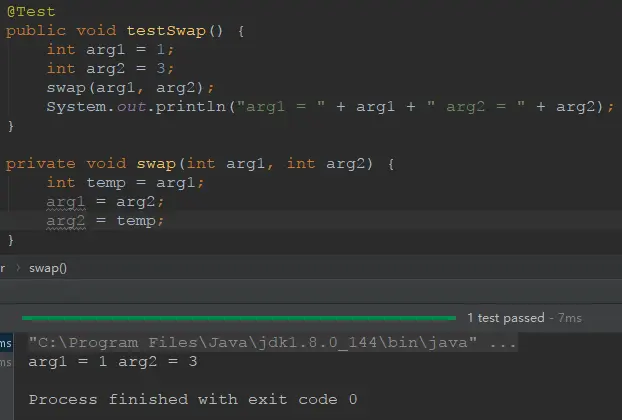 这是一个很经典的例子,我们希望在调用了 swap() 方法之后交换 arg1 和 arg2 的值,但事实上并没有,为什么会这样?