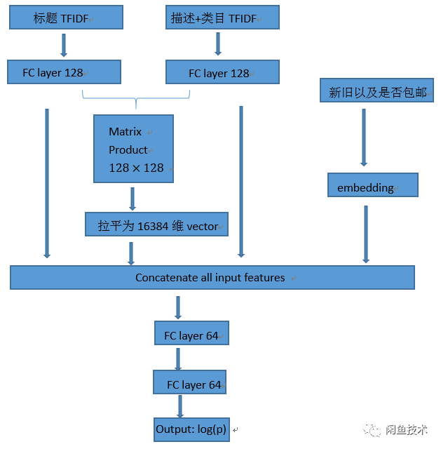 常识告诉我们商品标题的文本信息与商品的类目是密切相关的,通过数据分析我们也发现不同的关键词在不同类目下的分布完全不同。虽然一个好的神经网络模型可以catch到不同变量之间的相关性,但我们依然尝试了人为地加入了标题和类目间的交叉结构,其模型结构如下: