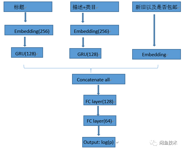 其次,数据应该以什么形式作为模型的输入, 商品的类目、商品的新旧程度,商品是否包邮作为离散标量,我们可以直接用one hot key encoding将其向量化,商品的标题和商品的描述作为文本输入,可以有多种处理方式,我们尝试了两种方案,(1) 用其TFIDF vector作为文本的向量化表示, (2)基于word embedding的GRU 模型。下面我们展开介绍这两个方案。