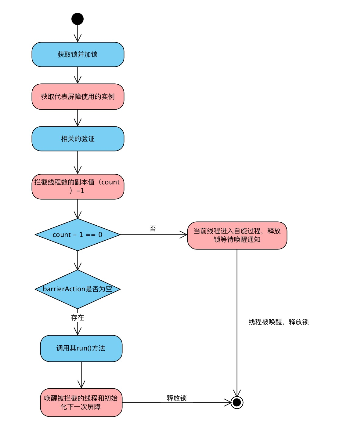 CyclicBarrier的字面意思是循环屏障。允许一组线程达到一个屏障(或者同步点)时被阻塞,直到最后一个线程到达屏障时,屏障才会开门,所有被拦截的线程才会继续运行。