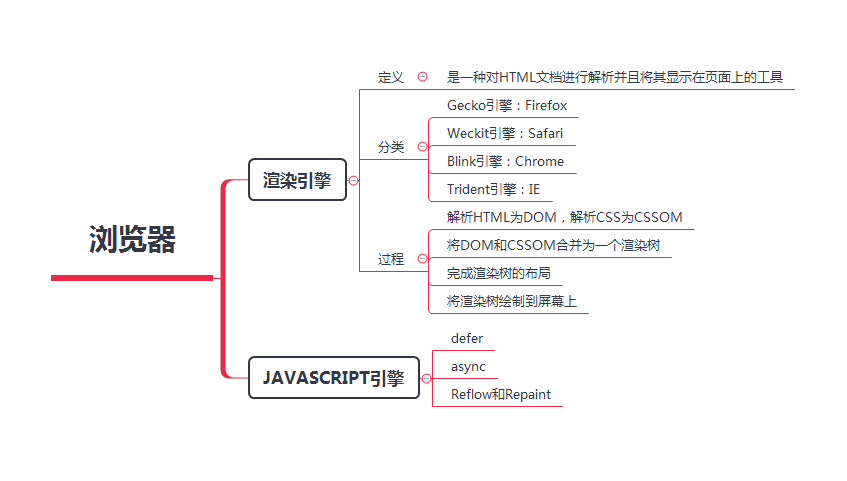 浏览器核心 Cassie1492949236626 2018-05-10 214 阅读1分钟 浏览器--渲染引擎和JavaScript引擎 下面这张图就是我对两个引擎做的一个简单的总结: Async defer Reflow和Repaint 重流和重绘并不一定一起发生,重流必然导致重绘,重绘不一定需要重流。比如改变元素颜色,只会导致重绘,而不会导致重流;改变元素的布局,则会导致重绘和重流。