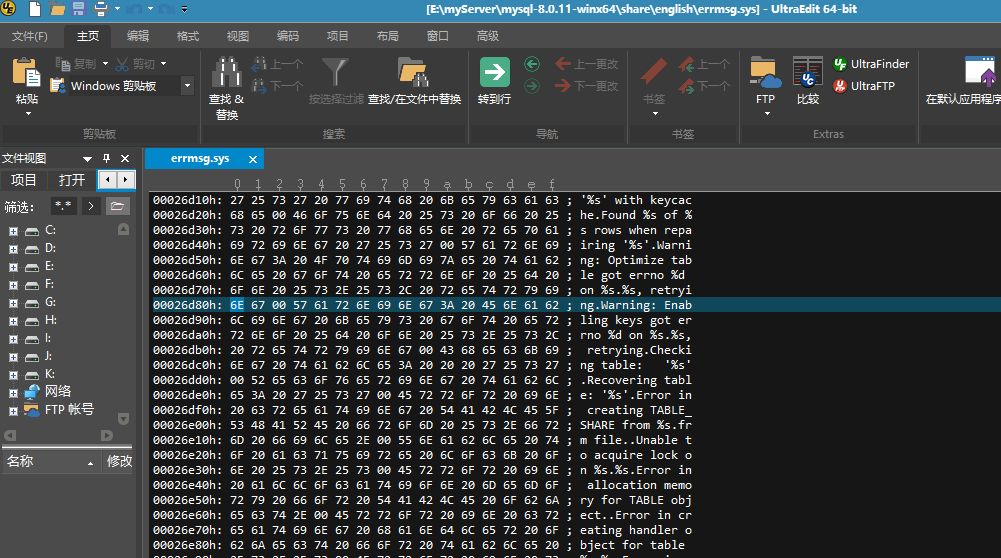 .sys是一种二进制文件,搜索用UItraEdit打开,看到了二进制源码。对于我这种只会Web开发的真是一筹莫展接下来想到了第二种方法,直接在errmsg-utf8.txt中替换eng中的英文为中文,可惜重启服务在结果中没有直接生效。猜测还是要读取.sys或者编译。