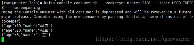 输入:**kafka-console-consumer.sh --zookeeper master:2181 --topic USER_TOPIC --from-beginning**