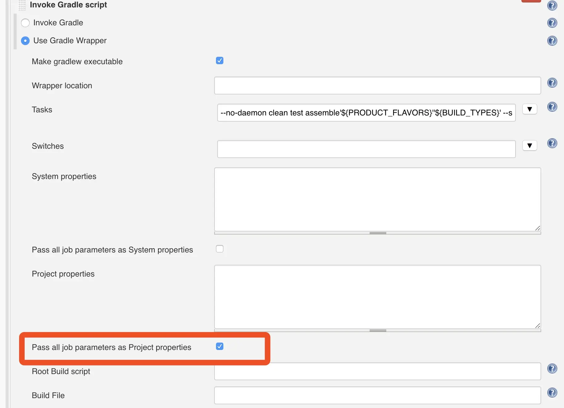 ** 这里最重要的地方就是标记部分,只有勾选该选项,gradle.properties的参数才能被Jenkins修改。**