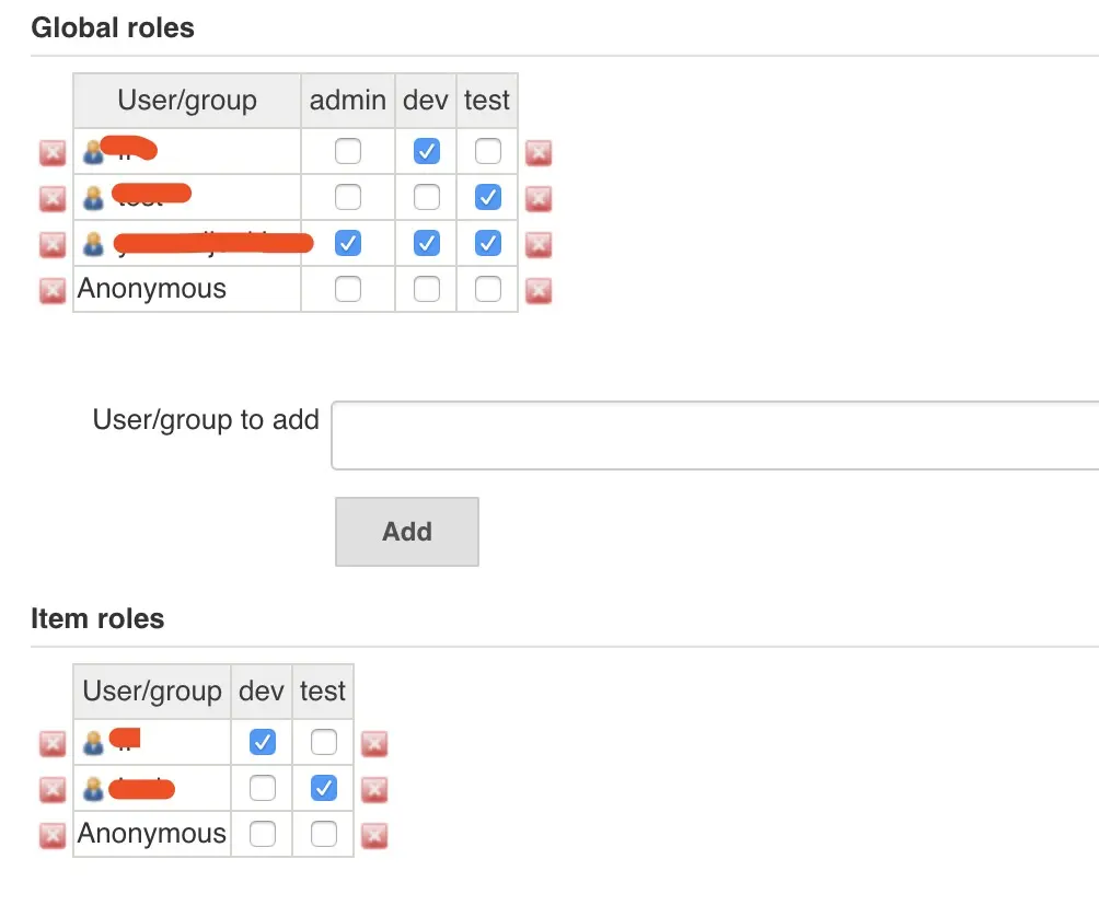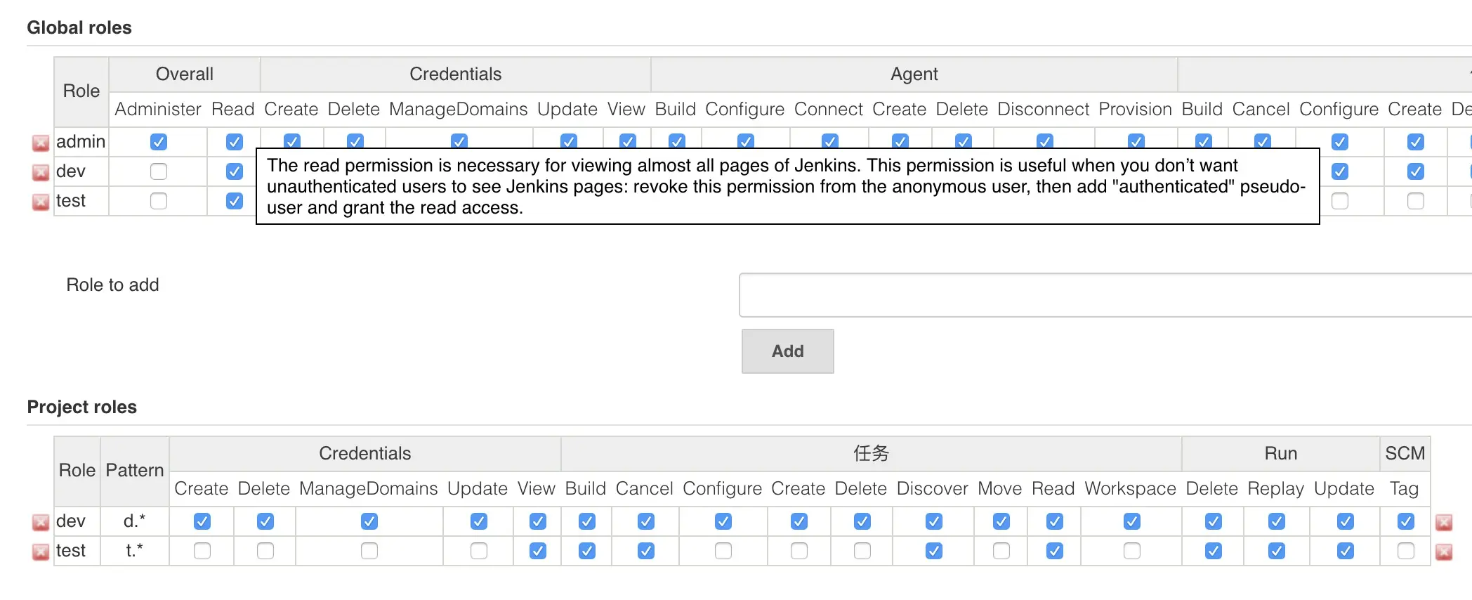 首先我们创建2个角色:dev,test。dev是分配给开发人员,可以对项目进行配置,test分配给测试人员,只能进行打包等简单操作。我们可以把鼠标光标移到权限名称上面,会显示权限描述。这里就不说明每个权限的作用了。