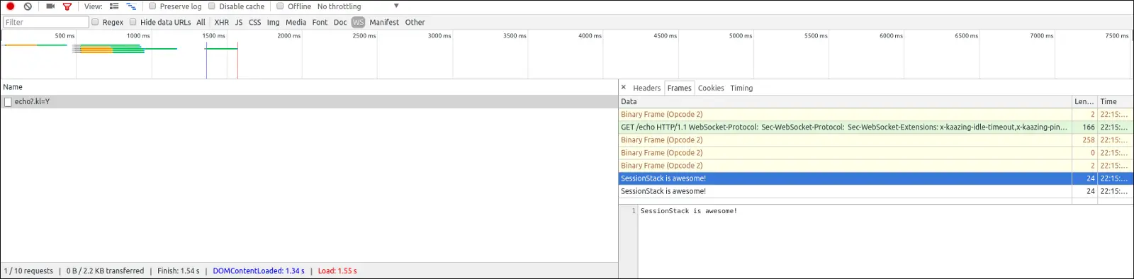 然而,整合进网页程序的 SessionStack 库应用了 WebSocket(优先使用,否则回滚到 HTTP)。它会打包并且向我们的服务器发送数据,这是单向通信。在这种情况下,之所以选择 WebSocket 是因为计划中的某些产品功能可能需要进行双向通信。
