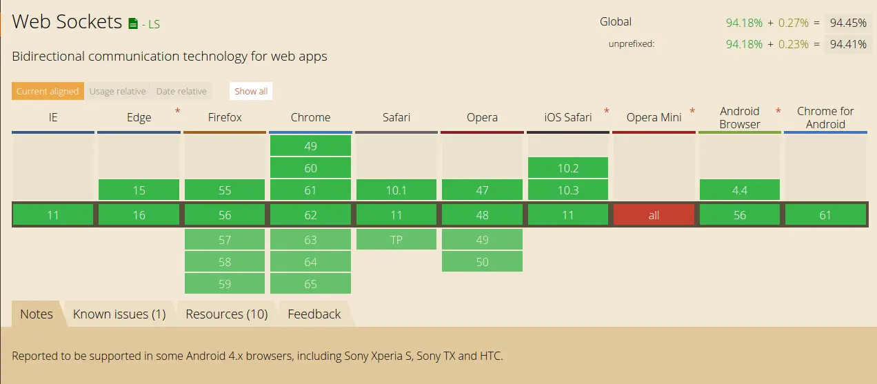 同样地,你不得不考虑浏览器兼容性。查看下 WebSocket 兼容情况: