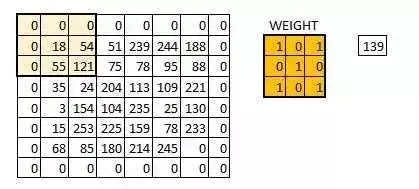 我们把权值初始化成一个 3*3 的矩阵。这个权值现在应该与图像结合,所有的像素都被覆盖至少一次,从而来产生一个卷积化的输出。上述的 429,是通过计算权值矩阵和输入图像的 3*3 高亮部分以元素方式进行的乘积的值而得到的。