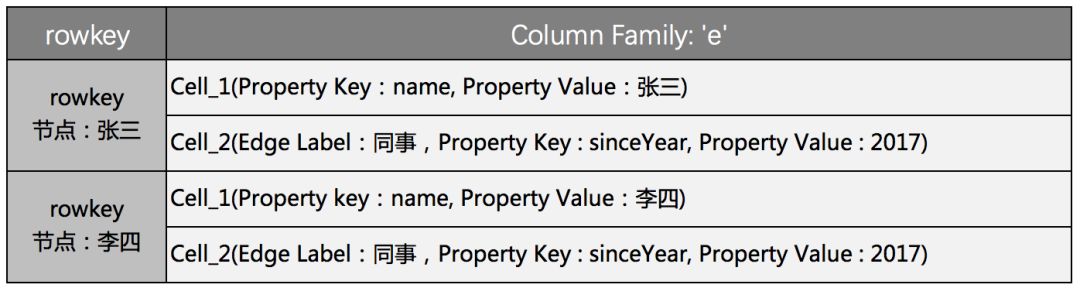 在JanusGraph中,是点为中心,按切边的方式存储数据的。节点的ID作为HBase的Rowkey,节点上的每一个属性和每一条边,作为该Rowkey的一个个独立的Cell。即每一个属性、每一条边,都是一个个独立的KCV结构(Key-Column-Value)。