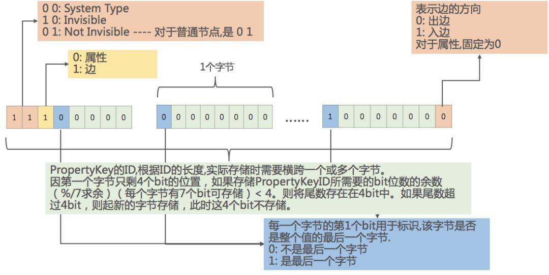 属性的ID作为一种无符号整数,JanusGraph将其格式化为多个字节。每一个字节的最高位比特用于表示是最后一个字节。0表示不是最后一个字节,1 表示是最后一个字节。