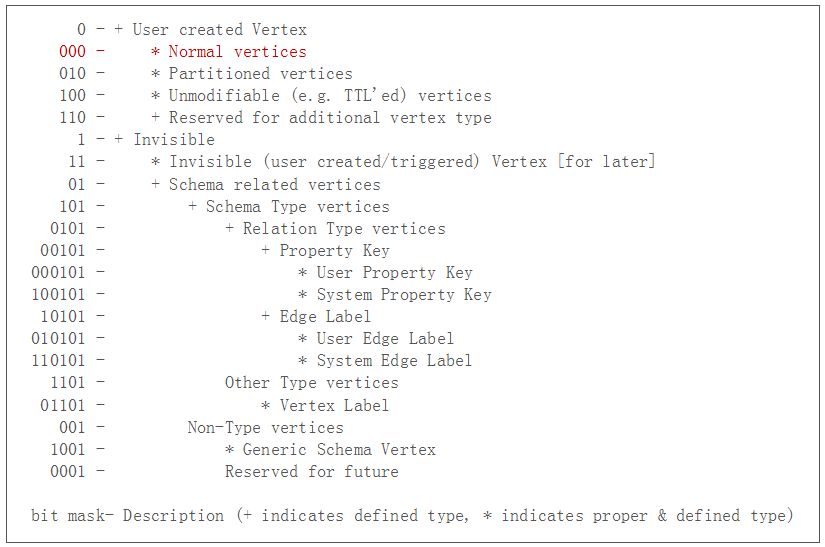 3. 最高位5个bit是partition id. partition是JanusGraph抽象出的一个概念。当Storage Backend是HBase时,JanusGraph会根据partition数量,自动计算并配置各个HBase Region的split key,从而将各个partition均匀映射到HBase的多个Region中。然后通过均匀分配partition id最终实现数据均匀打散到Storage Backend的多台机器中。